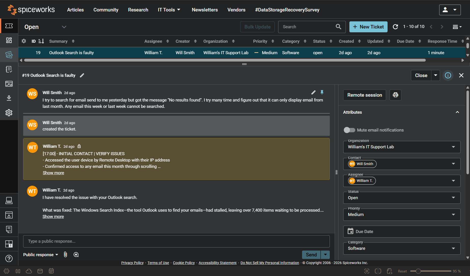 Screenshot: Complete ticket view in Spiceworks showing ticket flow and documentation (click to view full size)
